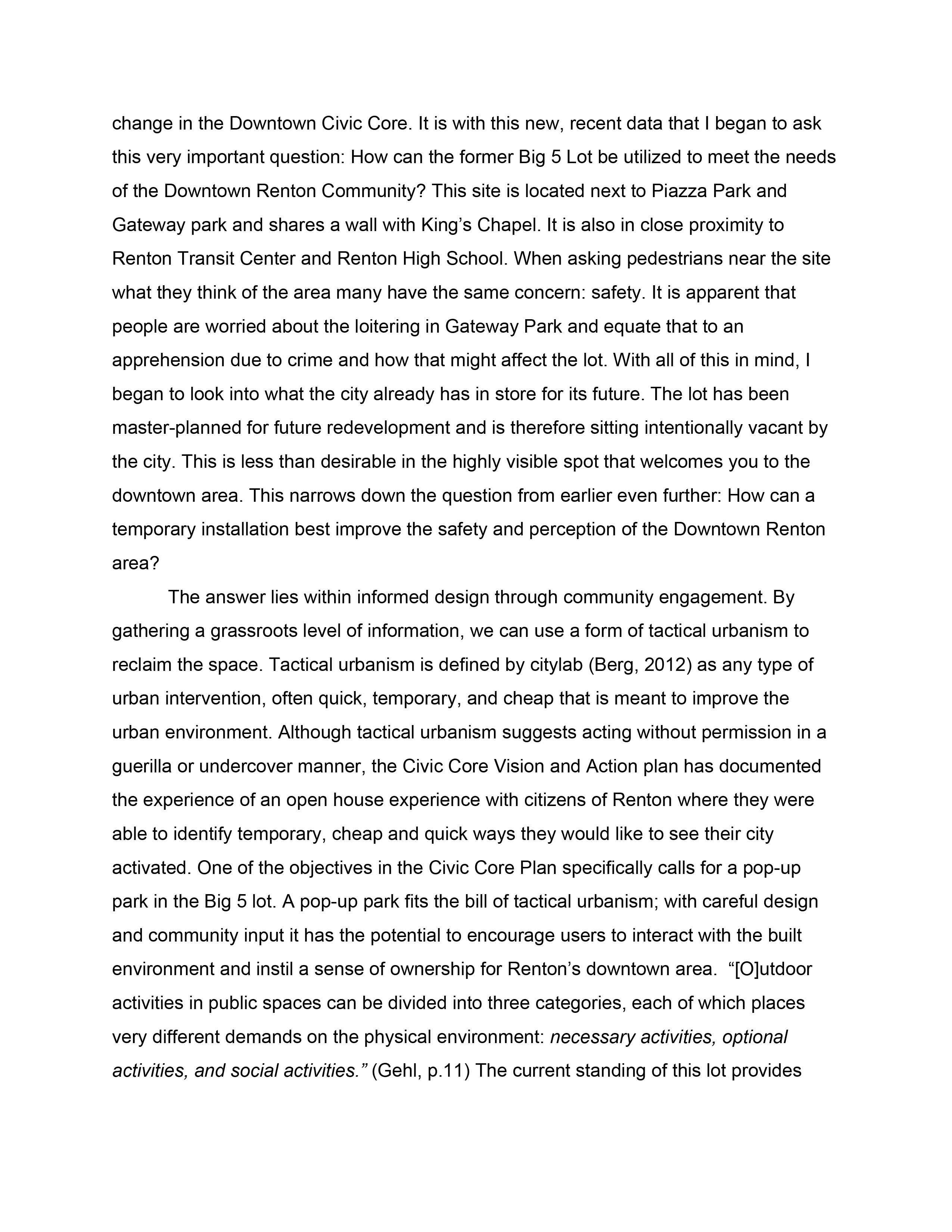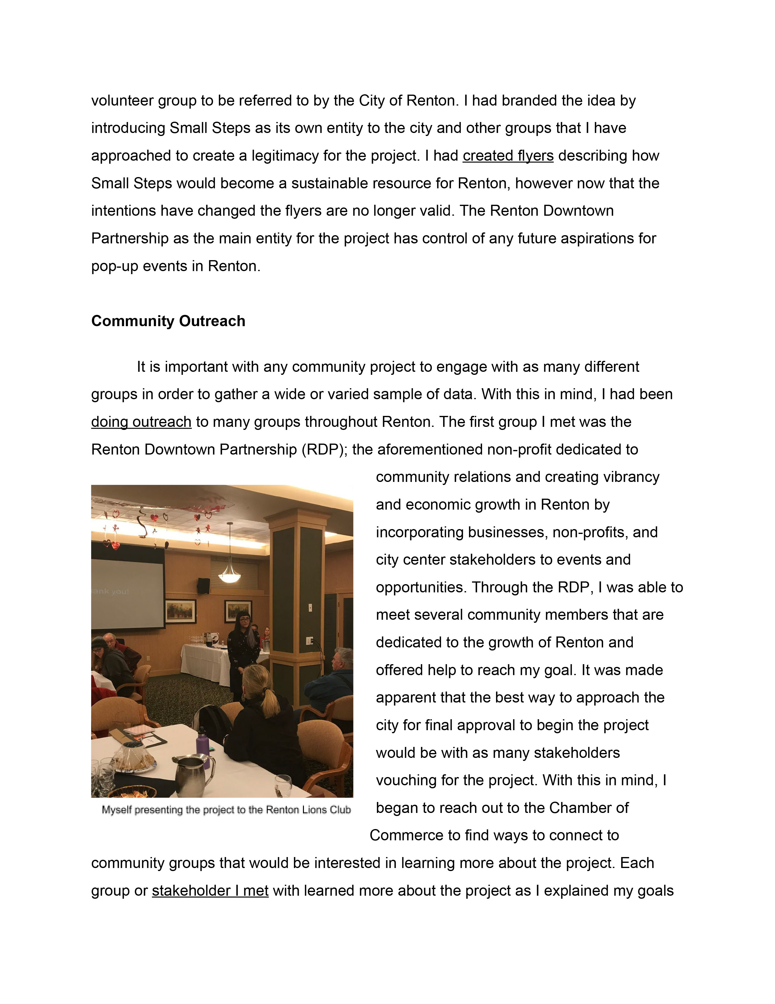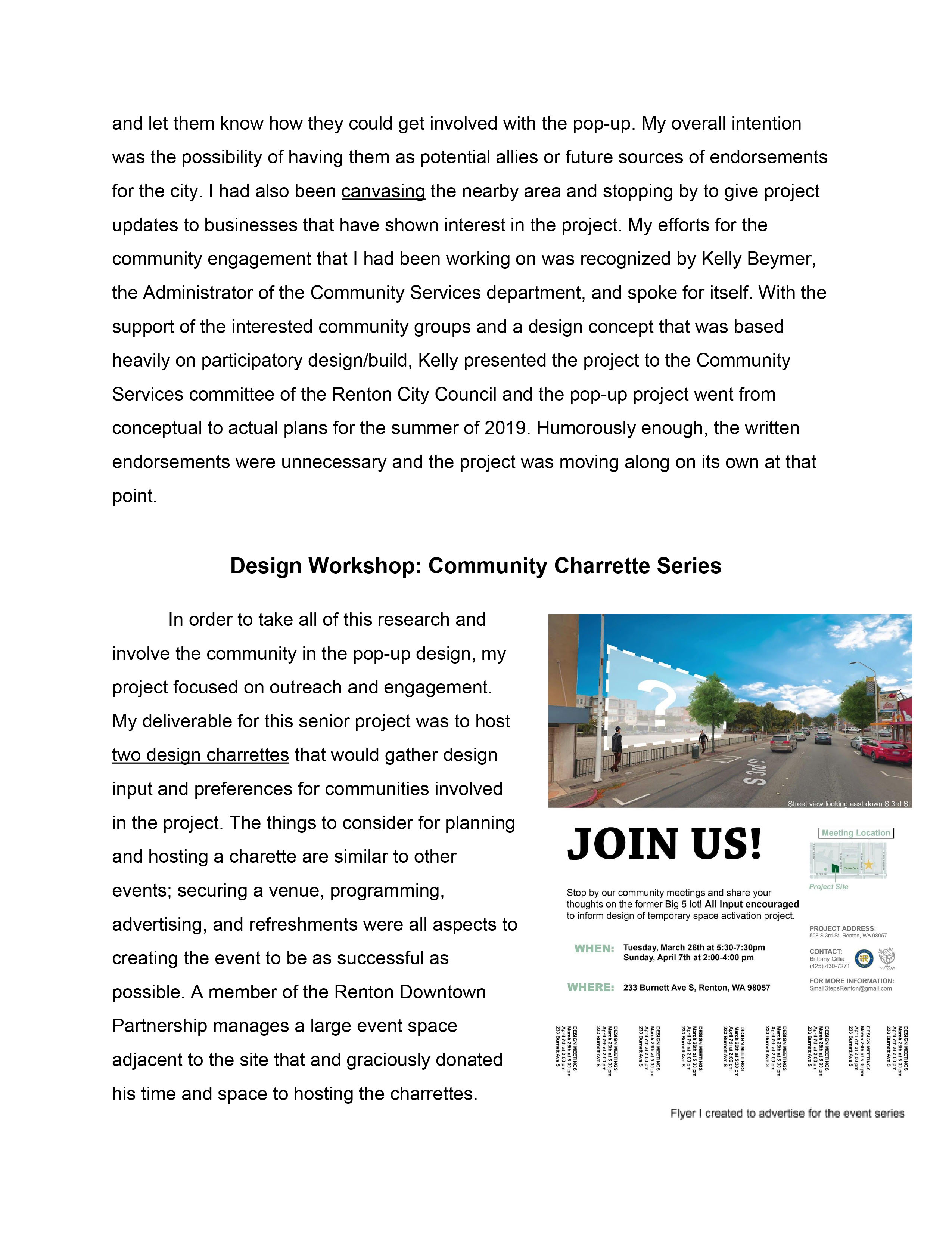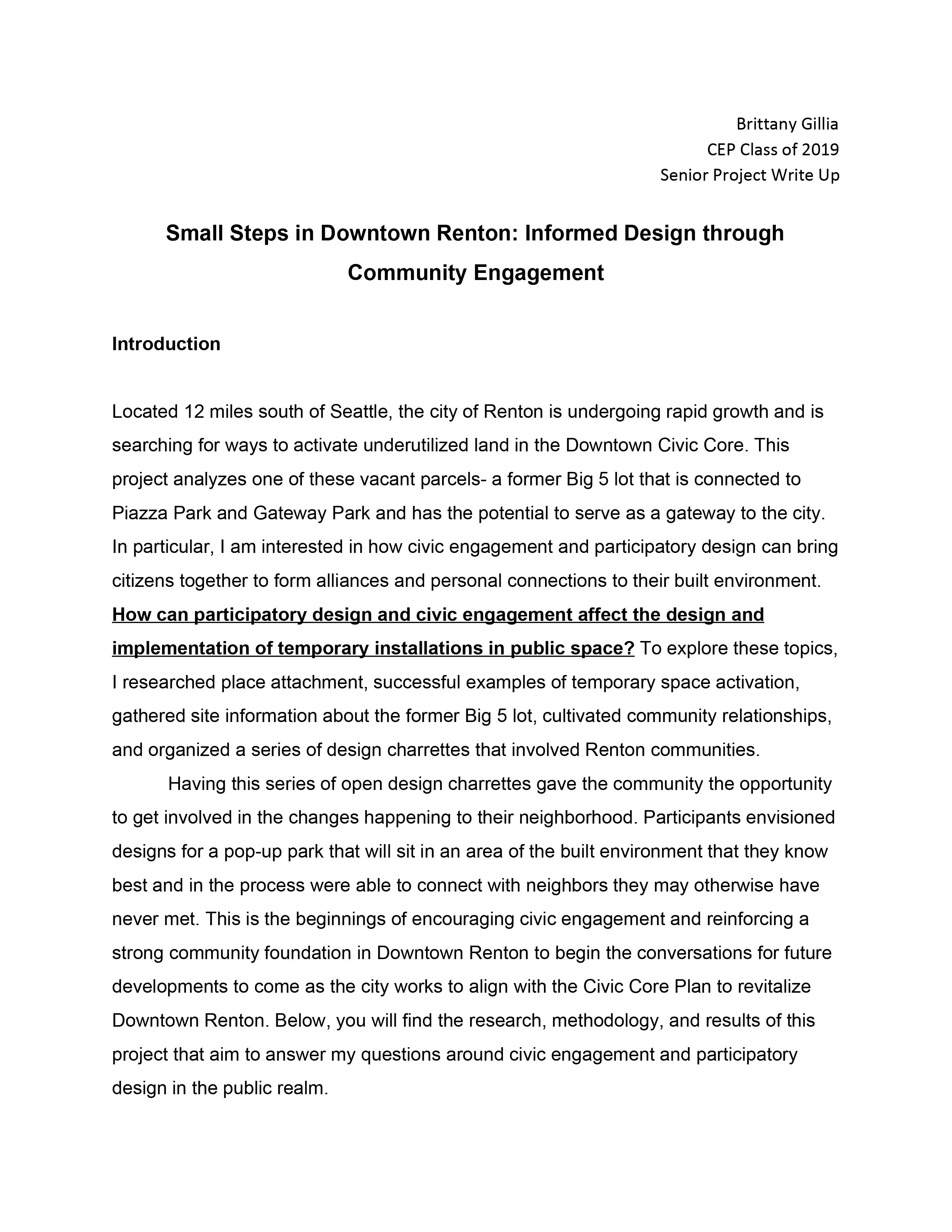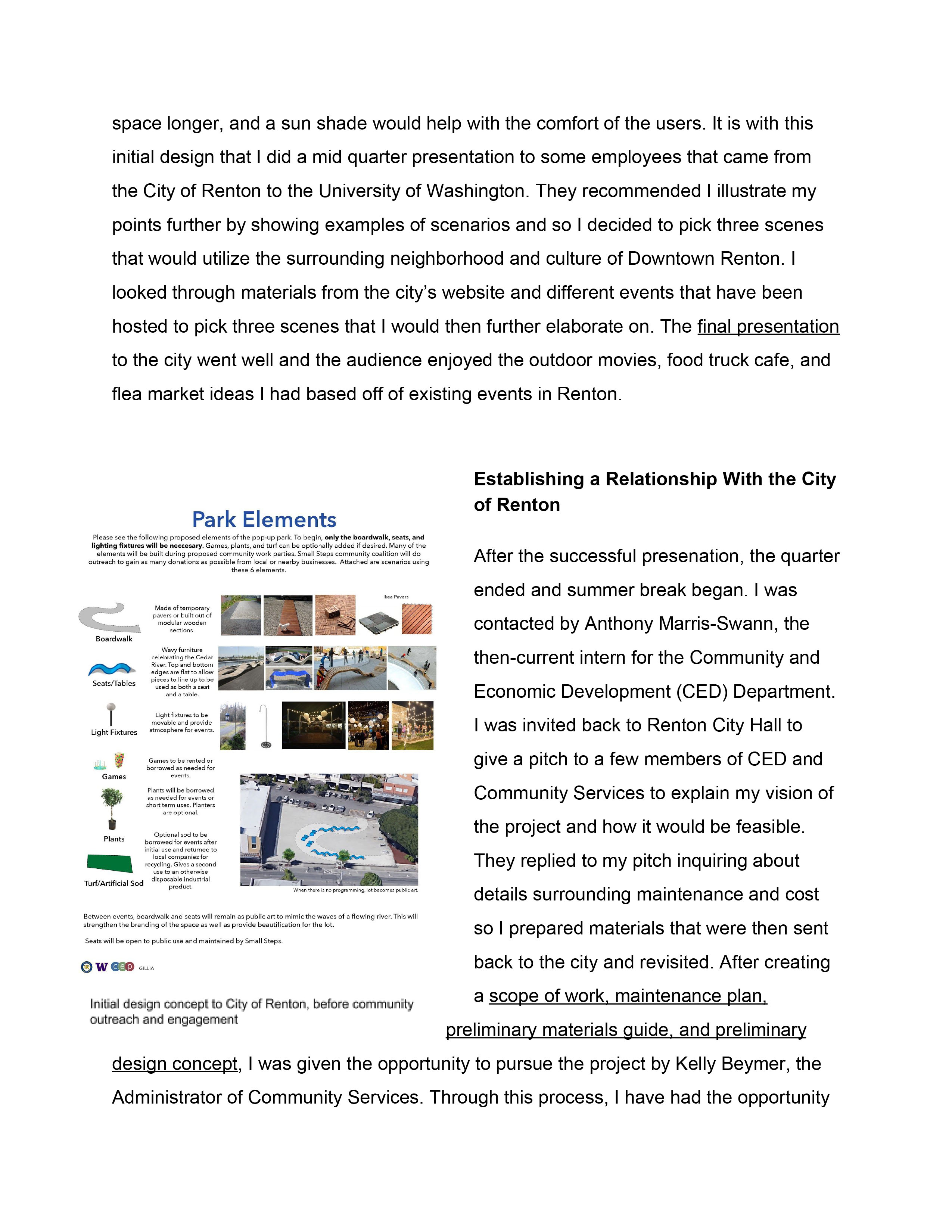 My senior project, Small Steps in Downtown Renton: Informed Design through Community Engagement has been a great step into the world and has taught me many lessons both academically and personally. Below, you will find my senior project write-up that details my methodology and thought process behind the project. To see the presentation materials used during my Senior Project Night presentation, click here.