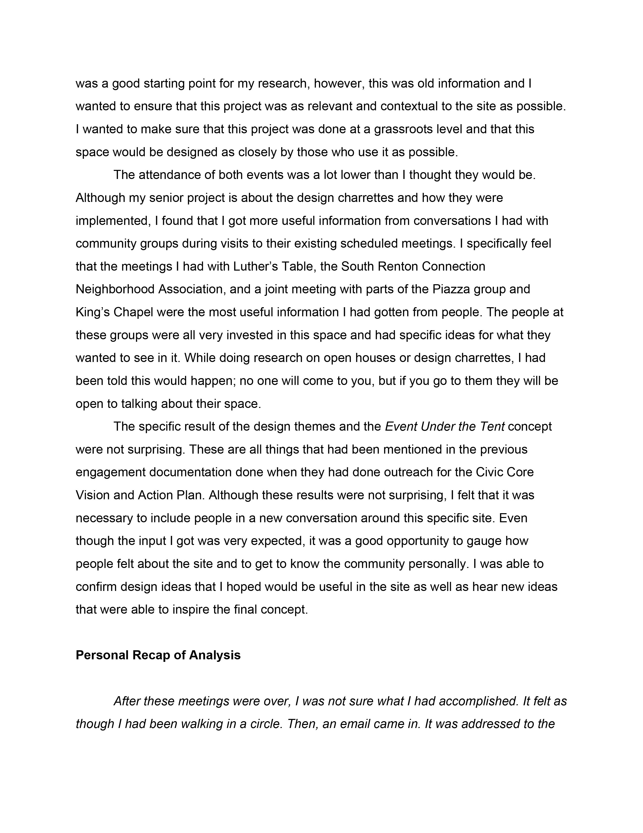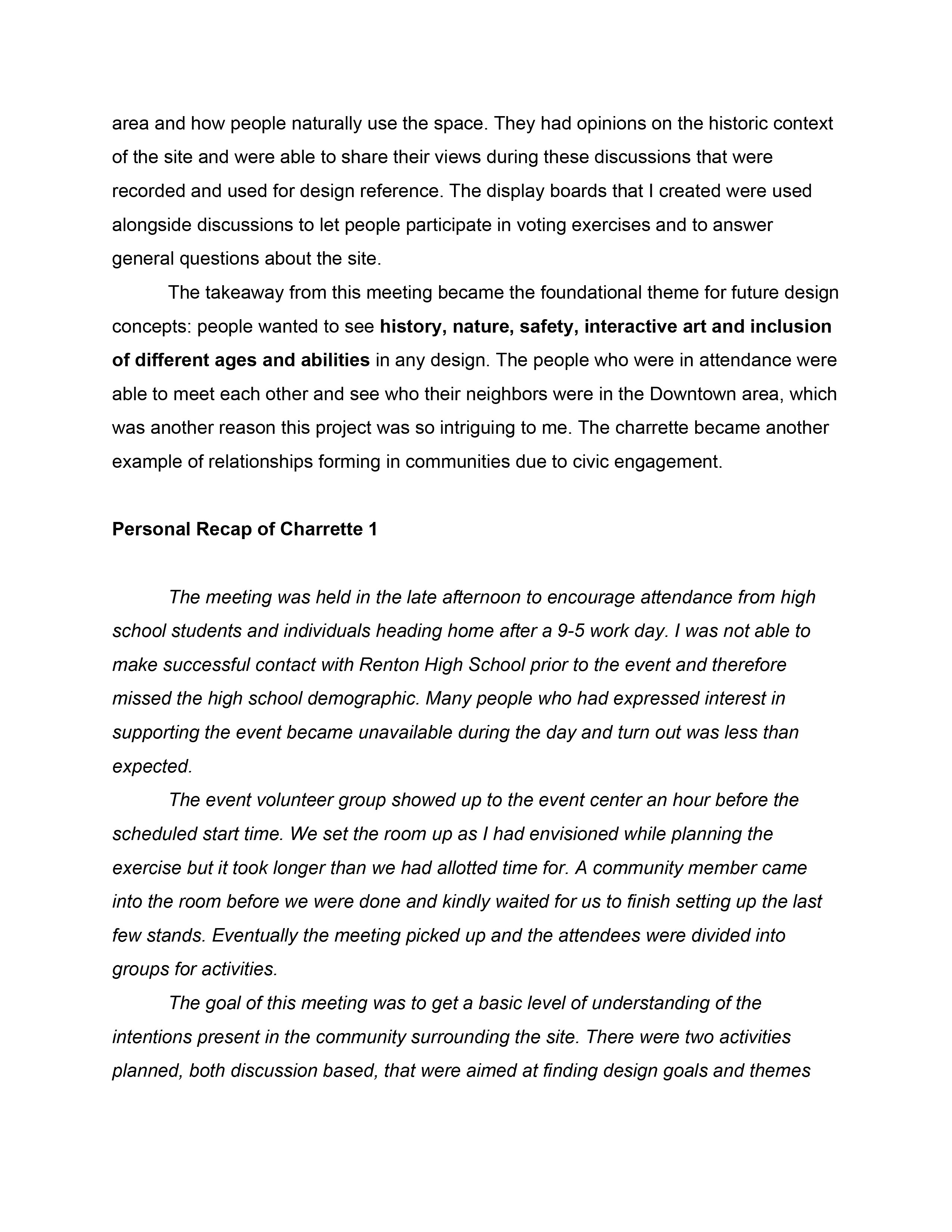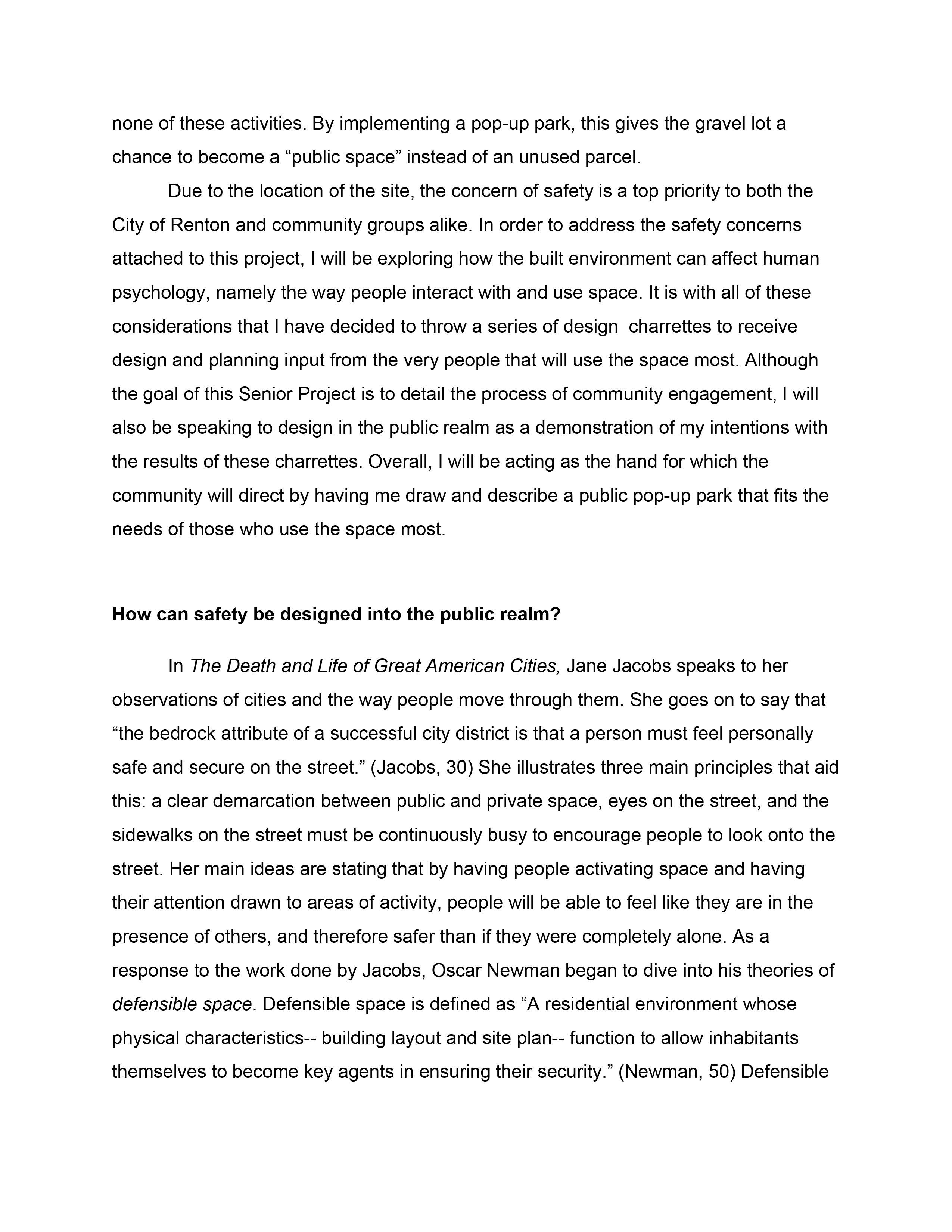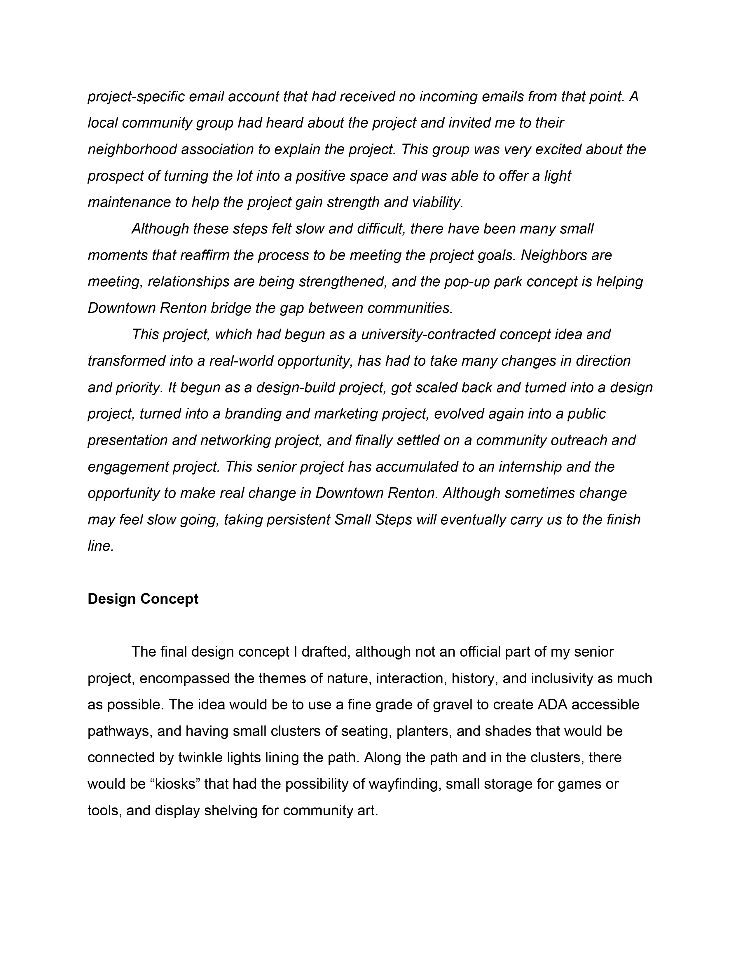 My senior project, Small Steps in Downtown Renton: Informed Design through Community Engagement has been a great step into the world and has taught me many lessons both academically and personally. Below, you will find my senior project write-up that details my methodology and thought process behind the project. To see the presentation materials used during my Senior Project Night presentation, click here.