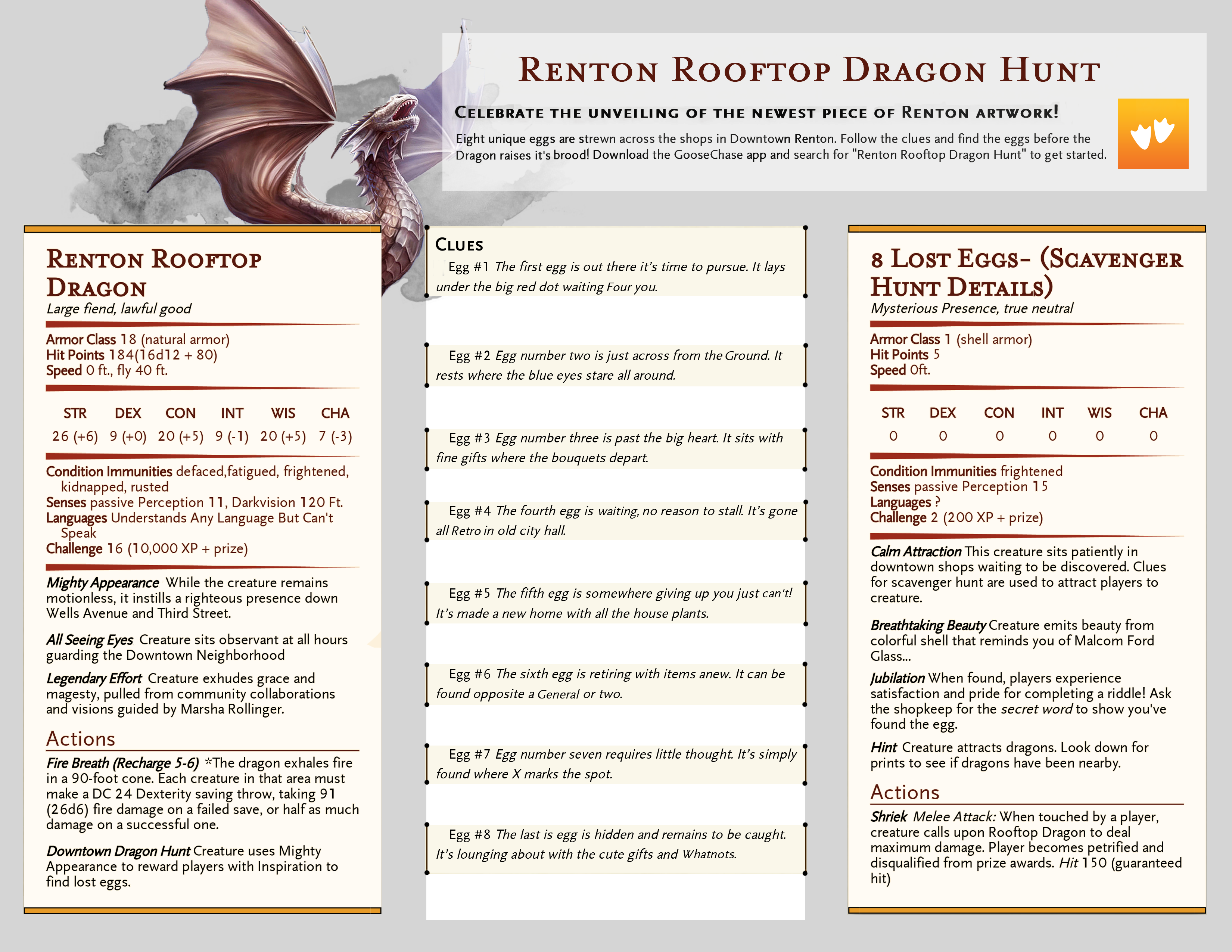 Front and back of scavenger hunt page created for unveiling of a dragon sculpture in Downtown Renton. Design themes based on Dungeons and Dragons to reflect a sponsor of the event.