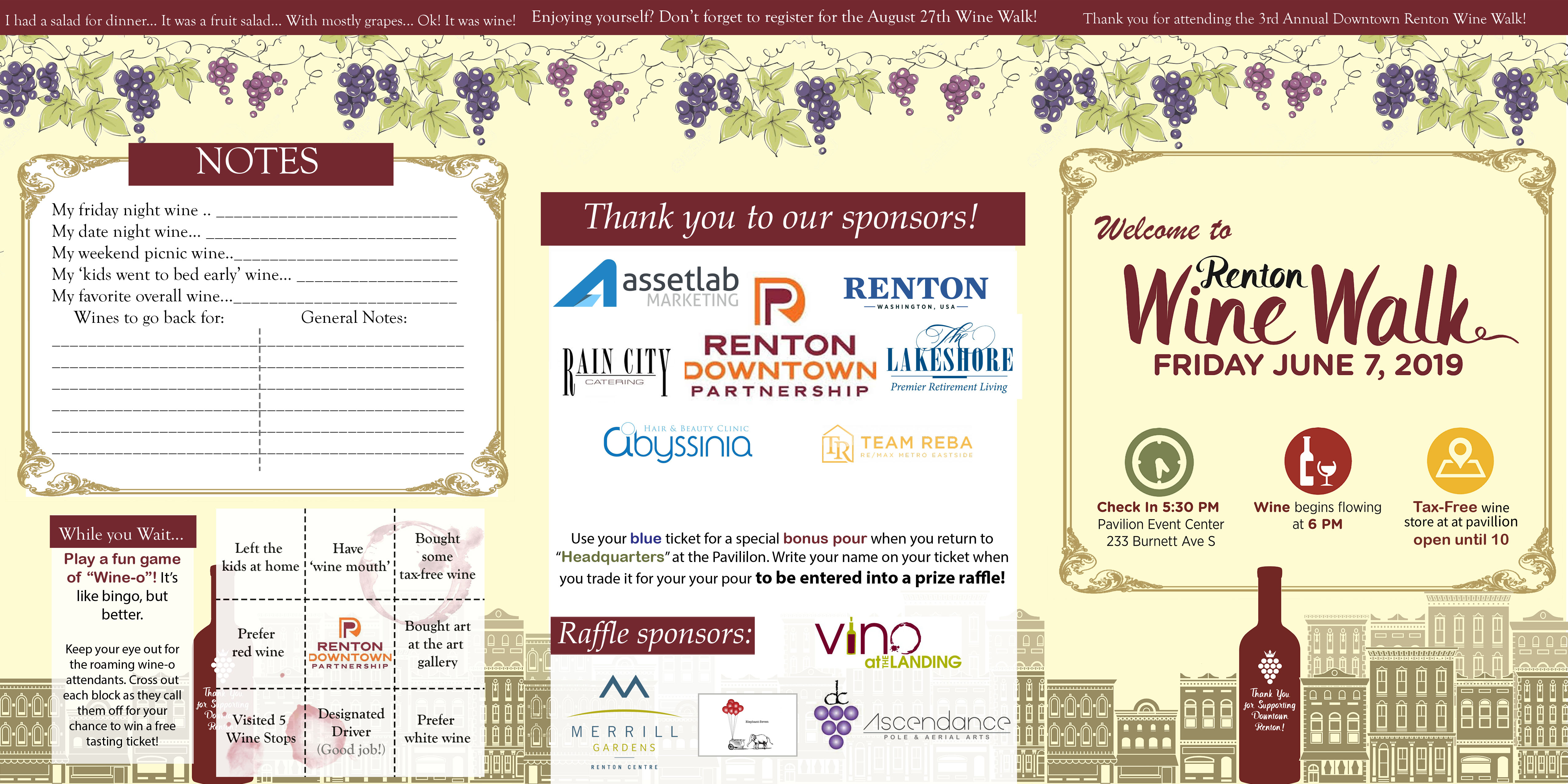 Tri-fold brochure for Renton’s June Wine Walk