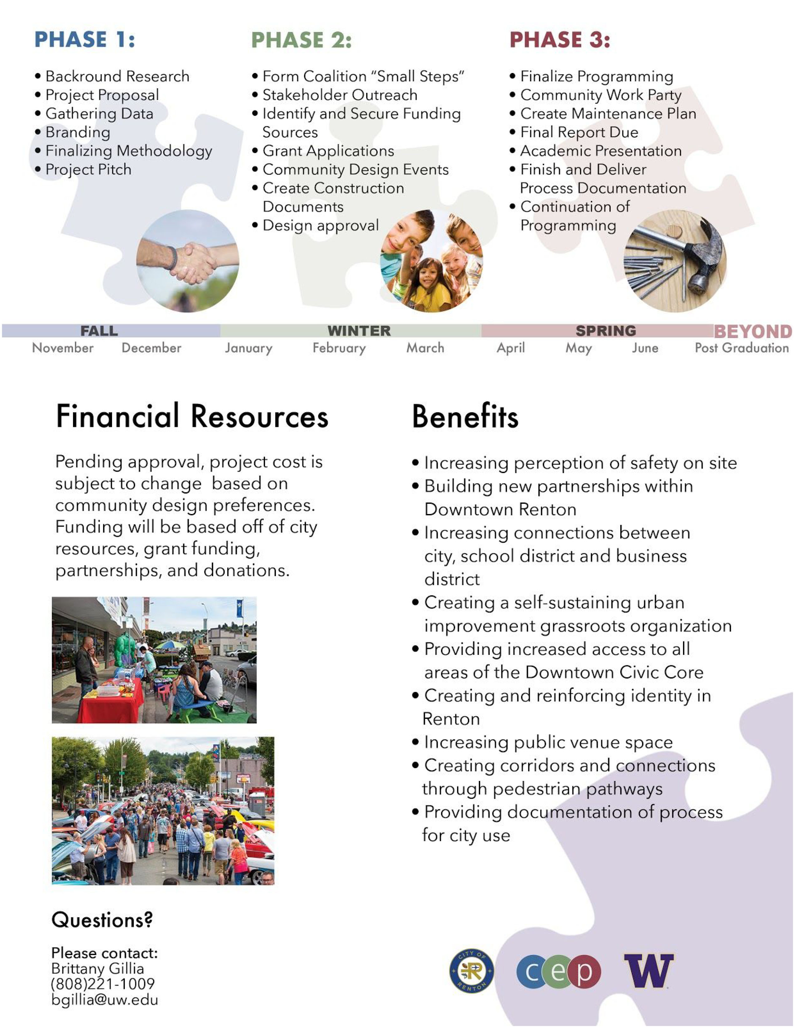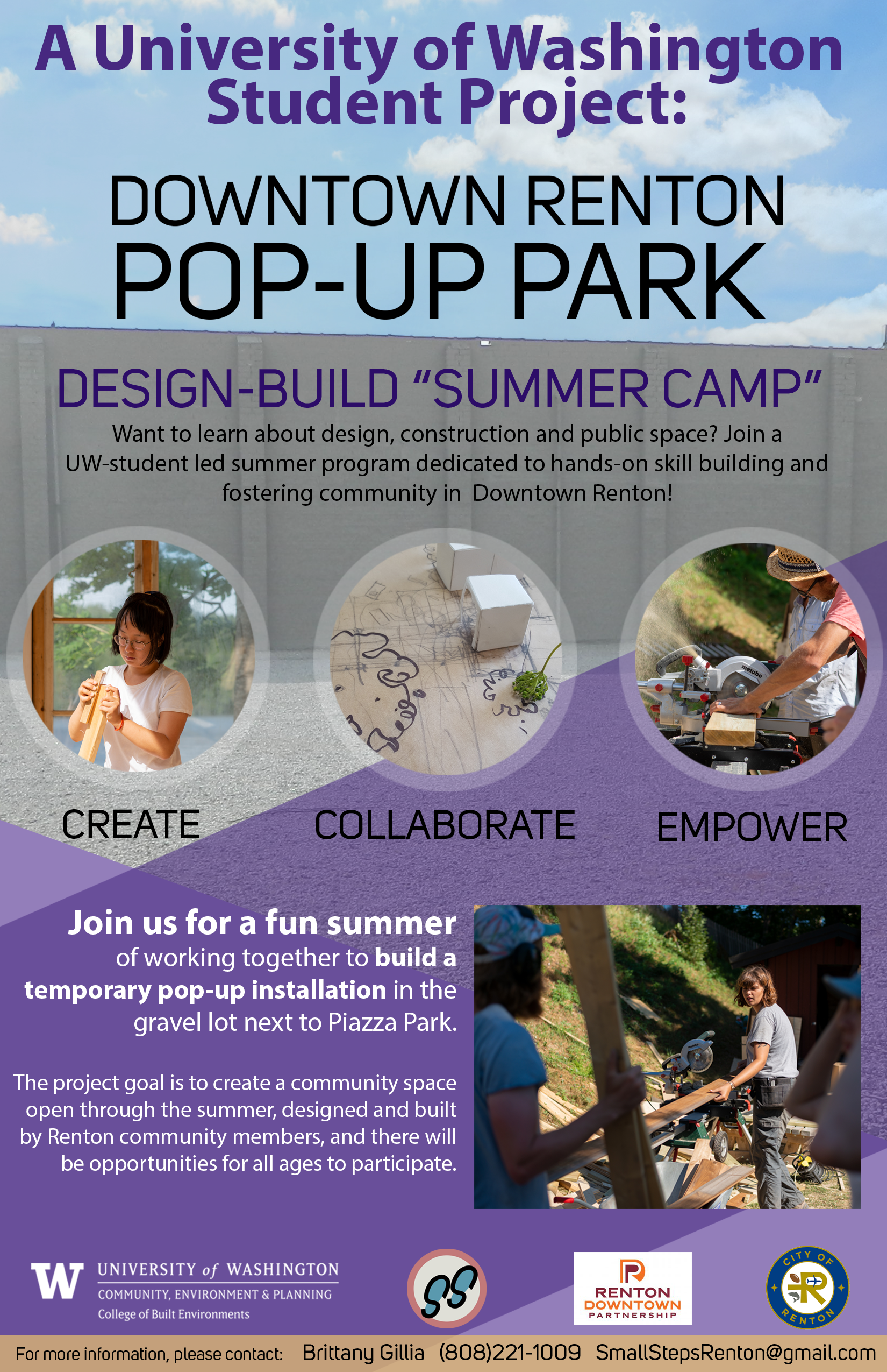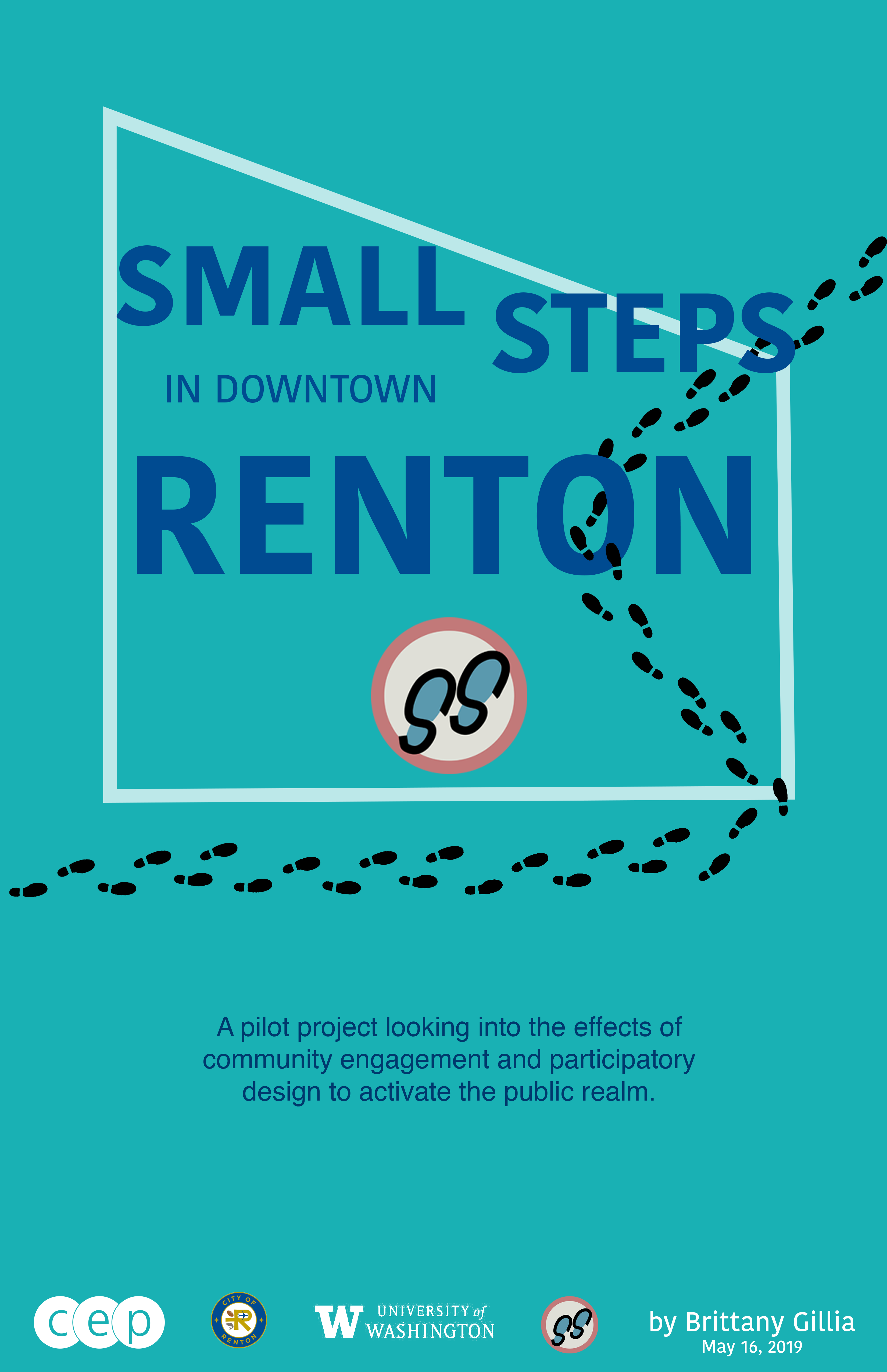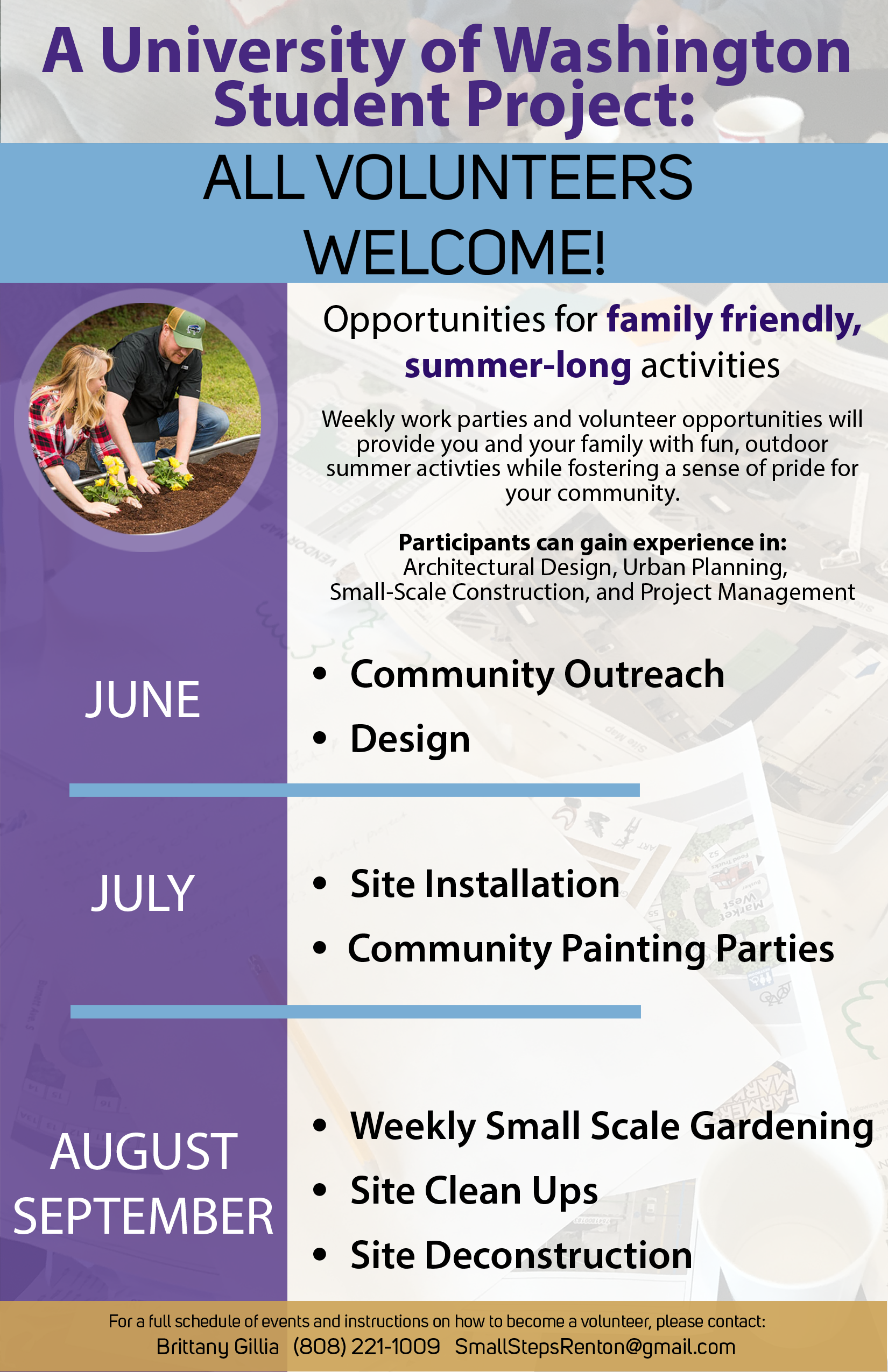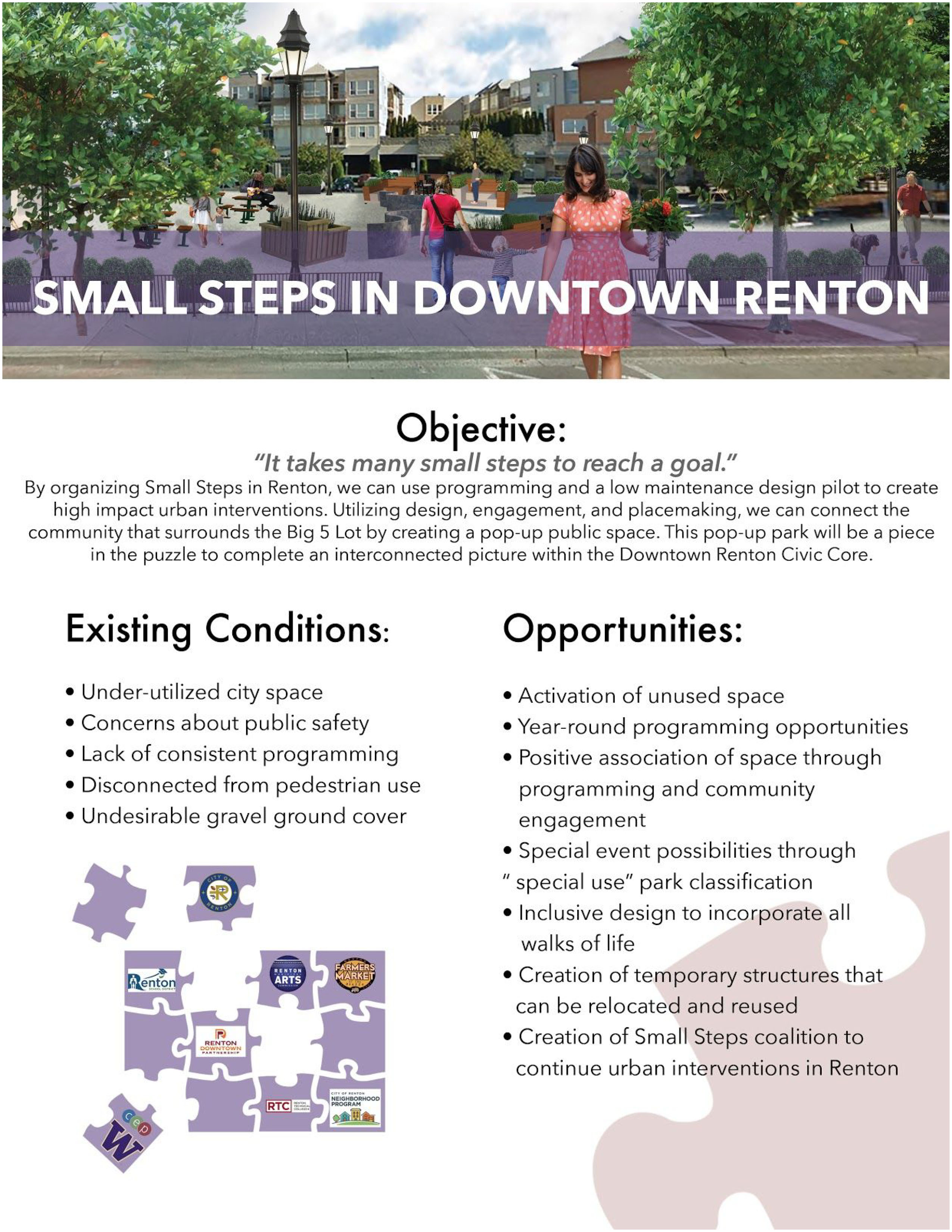 Small Steps is a group I created to be an organization of volunteers dedicated to the implementation and completion of the Downtown Renton Pop-Up project happening in the Summer of 2019. I am managing this group and gaining experience as a project manager, volunteer coordinator, and graphic designer by working with this group to implement the Pop-Up project. See the flyers below to get a look at the work Small Steps is trying to accomplish!